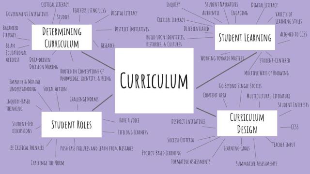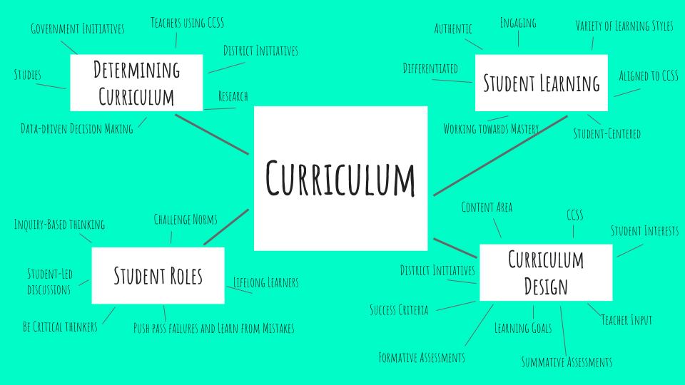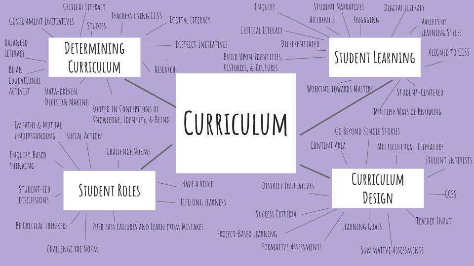 Prior to our book studies, we were asked to create a mindmap which centered on our current understandings of curriculum. We were asked to reflect on the following subtopics: student roles, student learning, how curriculum is determined, and curriculum design.